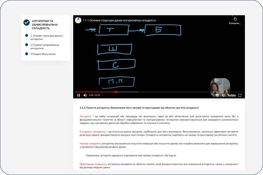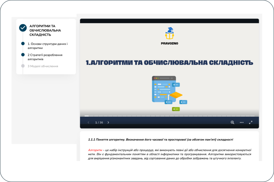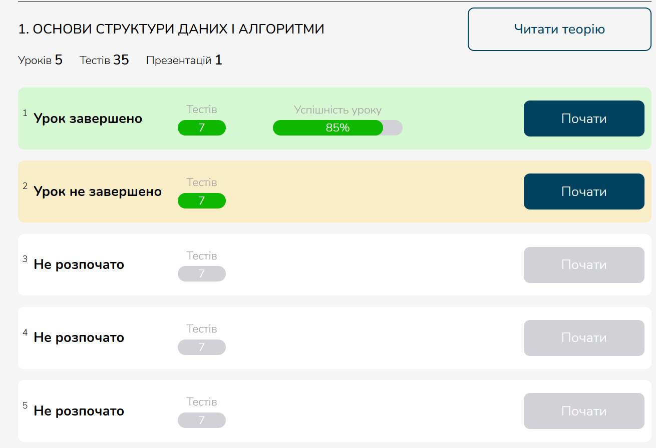 Готово! Розпочинайте навчання у зручному ритмі: проходьте тести з поясненнями, читайте теорію та знайомтеся з мультимедійними матеріалами.