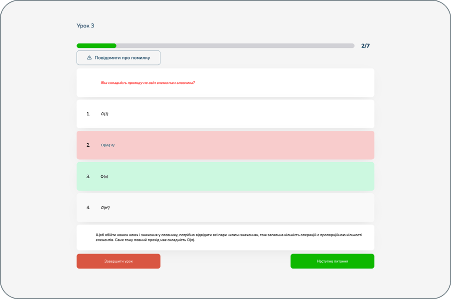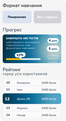 Обирайте зручний формат навчання: покроковий курс або все і одразу, змагайтесь з іншими користувачами платформи та відслідковуйте свою успішність.